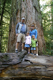 We went to Cathedral Grove near Port Alberni on Saturday. It was great to show the kids some BIG trees. the one we are posed in front of is the biggest in the park and is approximately 800 years old. We all fit inside another cedar that had a burned out core. Our whole family - inside a tree!